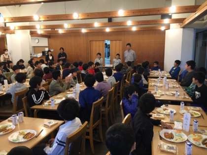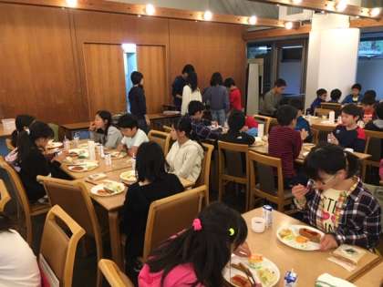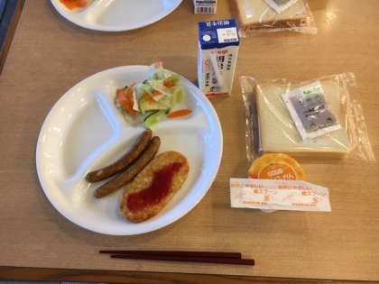 これまで美味しい食事を作ってくれたなかのビレジの方に感謝しながら、食堂での最後の食事を食べましょう。メニューは、食パン、イチゴジャム、ソーセージ、ハッシュドポテト、コールスローサラダ、ミカンゼリー、牛乳です。いただきます。