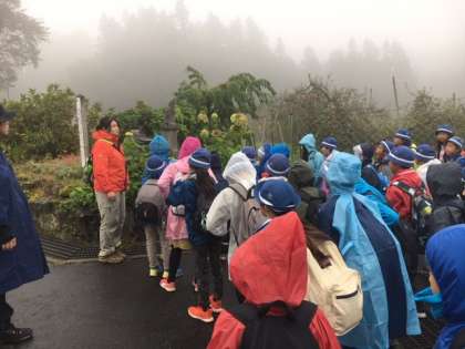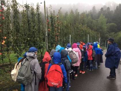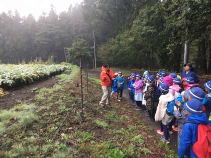 ところどころ、立ち止まって川場村の歴史や新しいりんご栽培、こんにゃく栽培などについて話を聞いています。