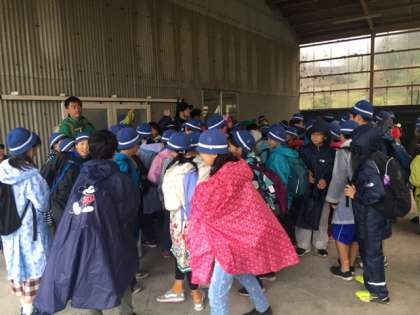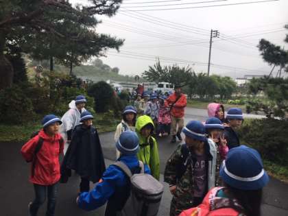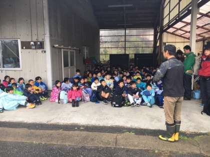 宮田果樹園に到着。九品仏小と一緒にりんご作りについて話を聞いてから、りんご狩りをします。