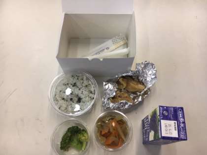 川場村での最後の食事です。お弁当の中は、わかめご飯、鶏の唐揚げ、ブロッコリーのおかか和え、きんぴらごぼう、ぶどうジュースです。美味しくいただきます。