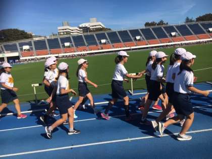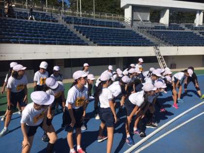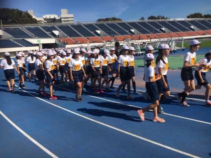 女子が準備運動、エンジョイランニングをしています。この後の競技は、女子から始まります。
