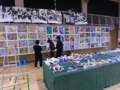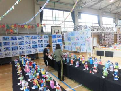 明日の8日(金)と9日(土)は展覧会です。子どもたちの作品が集まった体育館では、先生方が最後の確認をしています。どれもキラリな作品です。楽しみにしていてください。明日は、午前中が児童鑑賞、午後13時30分〜16時30分(最終入場16時)が保護者や地域のみなさんの鑑賞となります。ご来校いただき子どもたちの作品をじっくりと鑑賞してください。