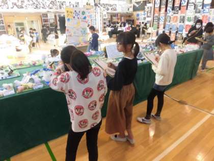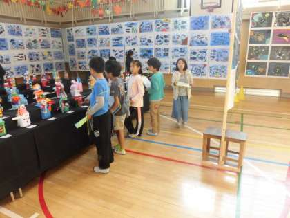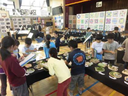展覧会の1日めの児童鑑賞の様子です。自分の学年以外の作品もしっかりと見ながらお気に入りの作品を見つけています。どんなふうに作るのか、どんな工夫があるのか、作品を見ながら会話している様子も見られました。