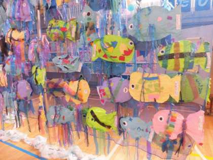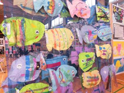 1年生の立体作品「ねったいぎょ」です。カラフルな熱帯魚がたくさん泳いでいました。
