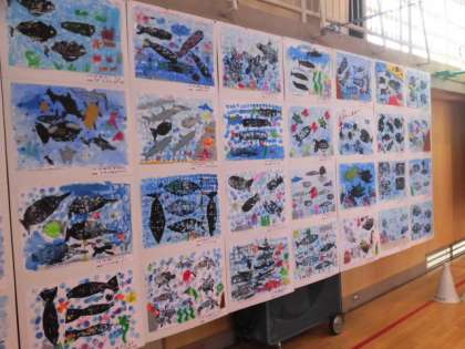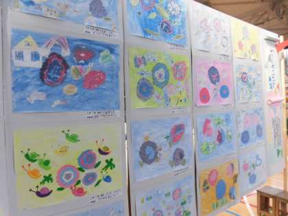 2年生の平面作品「あじさい」と「海の中をのぞいてみよう」です。思い思いに描いた色とりどりのあじさい。青い海の中では、たくさんの魚が気持ちよさそうに泳いでいます。