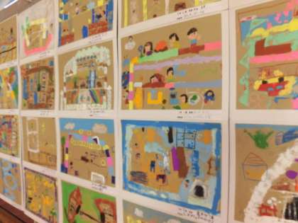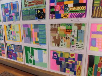 3年生の平面作品は「四角形をさがそう」と「スポンジハウス」です。「四角形をさがそ新聞紙の中から見つけた四角形に様々な色を塗って作りました。「スポンジハウス」はアクリル絵の具をスポンジを使って着色しました。