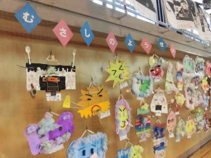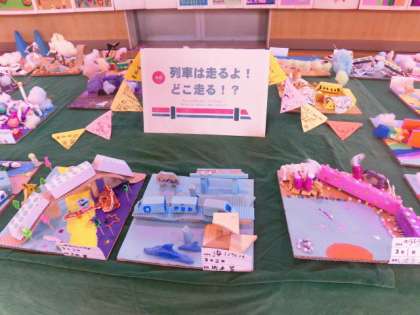 3年生の立体作品「むさしのようせい」と「列車は走るよ!どこ走る??」です。どれも武蔵丘小に住んでいそうなようせいがたくさんいます。はじめてのこぎりを使って作った列車がたくさん走っています。