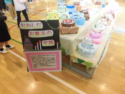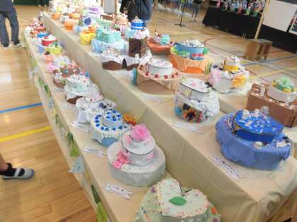4年生の立体作品「おかしなお菓子の宝箱」です。本物のケーキづくりと同じ手順で作った素敵なケーキ型の小物入れです。どれもおいしそうにできています。