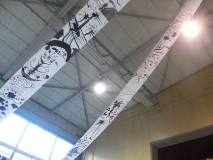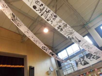 5年生の共同作品は、「墨の歌」です。墨絵の独特な濃淡が会場を飾りました。