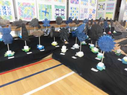 6年生の立体作品「メタリックアート」です。どう見ても金属でできているように見える作品。どんな風に作っているのかとても不思議な作品です。