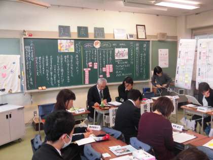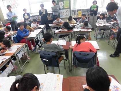 11月には2回の校内研究授業を行います。今回は3年1組で「バスの中で」というお話で授業を行いました。お年寄りに席をゆずる親切な行動。できたこともできなかったことも経験のある子どもたち。主人公の「わたし」の思いを考えながらグループで交流を行いました。授業後は、3年1組の教室で、講師の先生を交えて活発に協議が行われました。