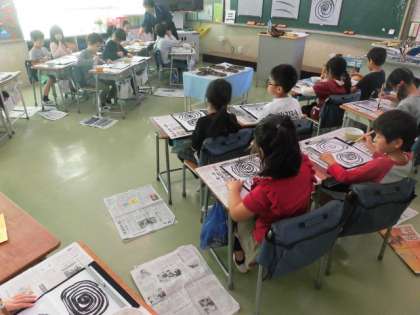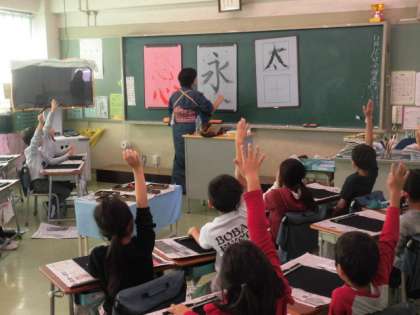 今日は、2年2組と3組が筆に挑戦です。クラスによって、子どもによって出来上がりはみんな違いますが、みんな楽しんで筆と墨に親しみました。3年生から始まる習字の授業が楽しみになりました。