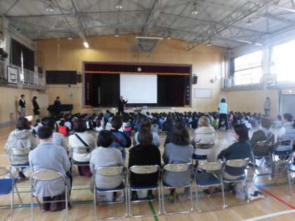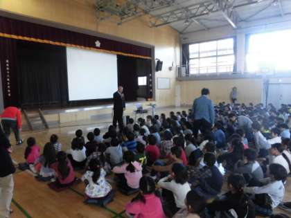 1・2年生は、3校時に体育館で「セーフティ教室」です。身の回りにある危険から、自分を守る行動を学ぶ「セーフティ教室」。今日は、成城警察の前頭スクールサポーター、松葉通駐在所の高橋さんに来ていただき、「いかのおすし」について、DVDを見て、話を聞いて学びました。これからどんどん暗くなるのが早くなります。安全な下校ができるようご家庭でも話し合ってみてください。