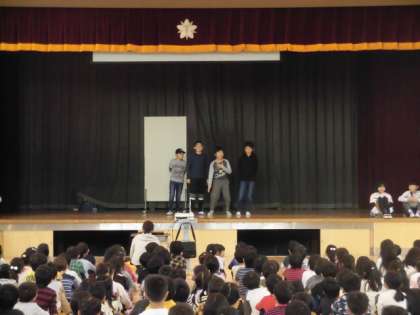 今日の委員会報告集会は、保健・給食委員会でした。インフルエンザがはやる時期をむかえ、どんなふうにインフルエンザにかかるのか?予防するにはどうしたらいいか?劇やクイズで楽しく教えてくれました。みんなで予防に努めていきましょう。