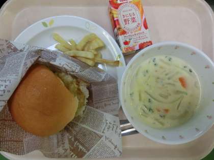 ハンバーガー・野菜ジュース・フライドポテト・エビチャウダー