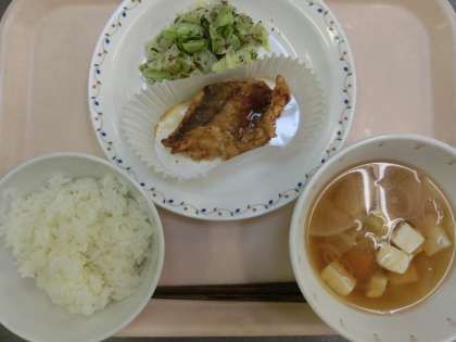 ごはん・魚のかわりソースかけ・野菜のゆかりかけ・のっぺい汁