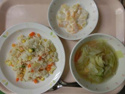 サケピラフ・ベーコンと野菜のスープ・フルーツヨーグルト