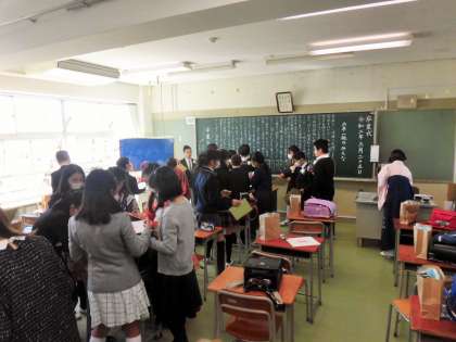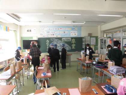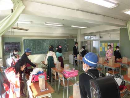 それぞれの教室で、卒業式の開始をまちます。色紙に図工で作ったハンコを押しあっています。久しぶりに会った子もいて、お休みに間の色々な話をしています。