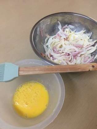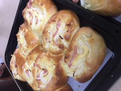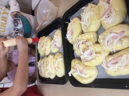 兄妹3人一緒にパンを作ってみました。強力粉 バターを計るのに一苦労してこぼしたり 軽量スプーンすり切りがとても難しかったです。パン種を50グラムに切って手でクルクルと丸めるのがすごく難しいけど頑張ってやりました。玉ねぎとハムは妹達が切ってマヨネーズで混ぜて 発酵が出来たパンをハサミで縦に切って間にのせてパンに卵をハケで塗ってオーブンで170度 15分焼いて出来た