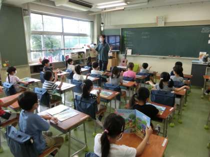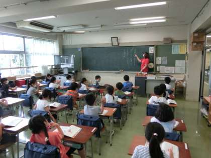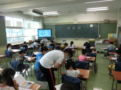 1年生の学習もすすんでいます。各教室では、ひらがなの「な」の字を学習したり、「おばさんとおばあさん」で伸ばす言葉を探したりしていました。音楽でも講師の袖岡先生の話をよく聞いて、楽しくリズムをとりながら学習していました。