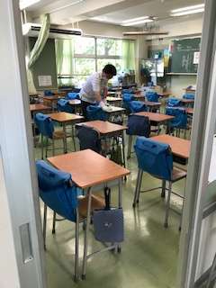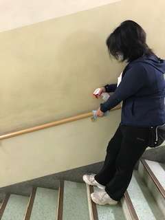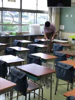 皆さんが帰った後、先生や主事さん方は、皆さんの机や椅子、階段の手すりなど、学校の様々なところを掃除して消毒をしています。