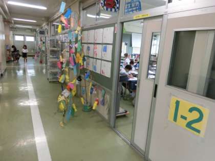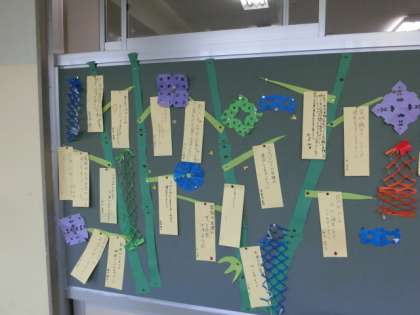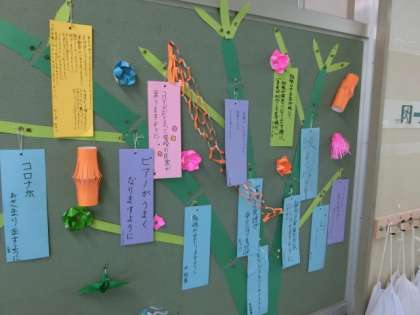 本日は「七夕の日」です。給食では「七夕汁」と「星のゼリー」が出ました。また中庭に育っている笹を切って、1年生の教室前に願いごとの書いた短冊を飾りました。今年は6年生も願いごとを書きました。1年生の願いごとには「あさがおがおおきくそだってほしいな」「ともだちがいっぱいできますように」など、6年生の願いごとには「家族が仲良く健康でいられますように」「コロナがおさまりますように」など、いろいろな願いがありました。みんなの願いが届くといいですね。