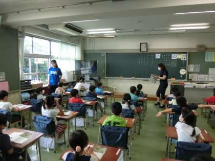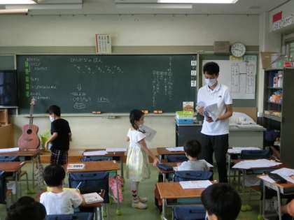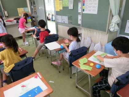 今週は雨の日が多いので教室ですごすことが多いです。ひらがなの学習も「ぬ」まで進みました。とてもむずかしい字ですね、上手に書いていました。算数ではひきざんの学習。水そうに入っている金魚の数で考えました。図工は「ちぎってはって」、サポートの杉本先生にも協力してもらいながら、画用紙をちぎって貼って、好きな動物や乗り物などを上手につくっていました。