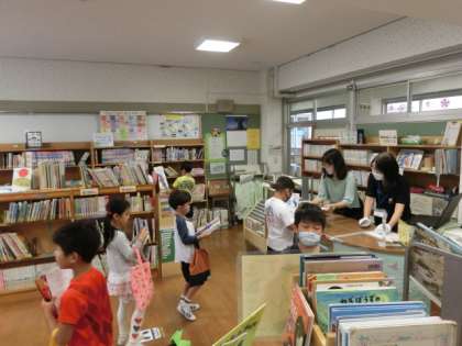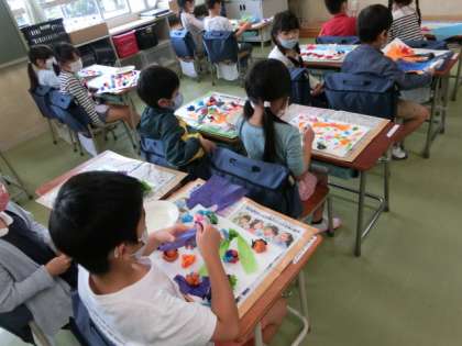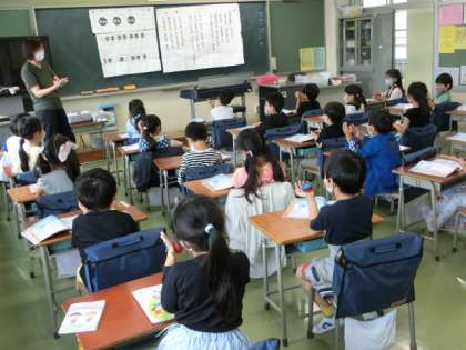 今日も雨が降り続いています。1年生のみなさんも教室で静かにすごしています。図工では「ちぎってまるめて」、好きな色のお花紙をちぎって丸めて、トンネルや虹をつくっていました。色使いがとてもきれいです。音楽では「しろくまのジェンカ」という曲に合わせてカスタネットをたたきました。リズムよく上手にたたいています。図書の時間も始まりました。蜜を避けるため、2グループに分かれて図書室に行きます。図書カードの書き方も上手になってきました。