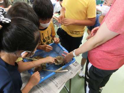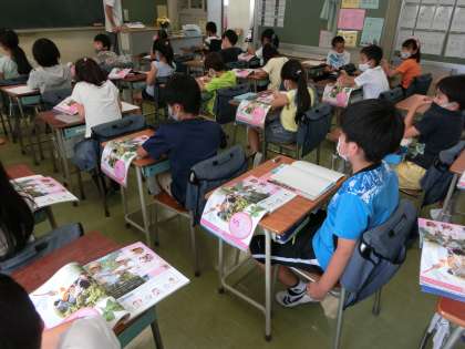 3年生はホウセンカとヒマワリを育てました。今日はヒマワリの種の観察をしました。ヒマワリの花にはたくさんの種がついていました。「これ、数えるといくつあるんだろう?」「ホウセンカの種と比べると、ヒマワリの種のほうがずっと大きいね」と話していました。他には「夕日がせなかをおしてくる」の詩を読んだり、校庭に出て虫さがしに出かけてたりしていました。