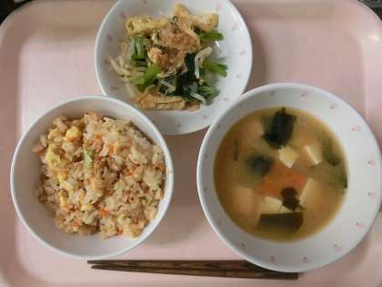 そぼろごはん・油揚げと野菜のおひたし・みそ汁