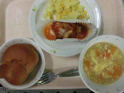 ココアパン・白身魚のピザ風・コーンポテト・トマトとたまごのスープ