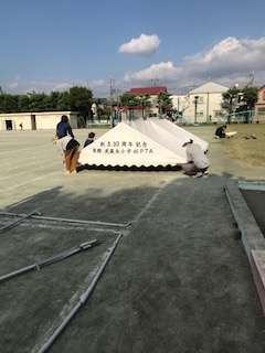 全児童分なので、かなり大量のテントを建てなければならなりません。前日準備の時間だけでは足りないので、今年度は前々日準備を設定して、テントの一部をつくりました。残りは、明日の前日準備で、保護者の方にお手伝いいただき完成させる予定です。