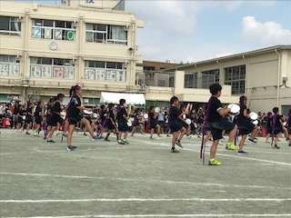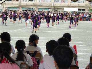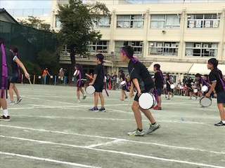 4年生の元気な掛け声と太鼓の音が学校中に響き渡りました。黒のTシャツと紫のはち巻きで、かっこよくきまりました。