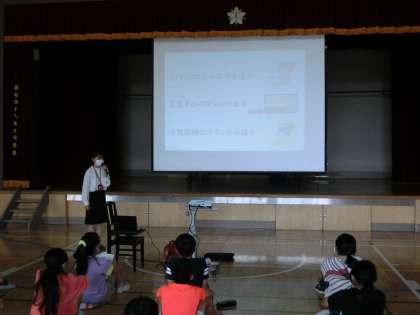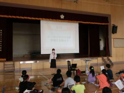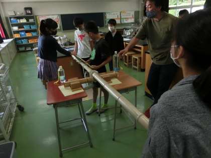 3校時と4校時に体育館で、クラスごとにネットリテラシー醸成講座が開かれました。(株)教育ネットの方が講師として来てくれました。メッセージが届く仕組みから、インターネットやデジタル技術をどのように活用していくか、情報モラルの視点から考えました。最後のまとめで、インターネットをどのように使っていきたいかの質問に「相手の気持ちを考えて書き込む」「ブレーキをかけられるようにしたい」と自分なりに考えて答えていました。理科では「てこ」の学習をしています。手作りの大型の竹のてこを使って、重りがつり合うように考えていました。大型の竹のてこは、実体験ができるで、とてもよい器具です。