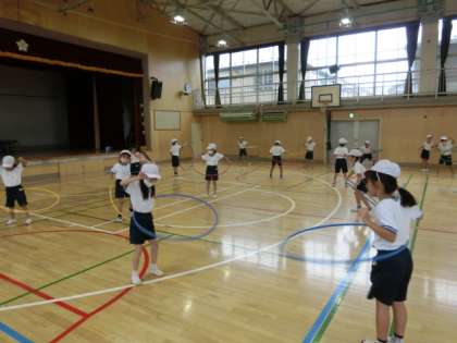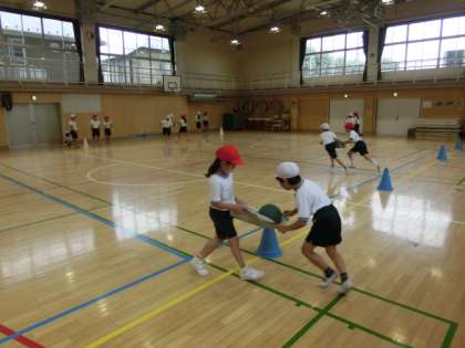 国語ではアーノルド・ローベル作の「お手紙」を学習しています。物語を読んで、お手紙を一文でまとめたり、みんなで音読のしかたを考えたりしました。速く読めばいいか、ゆっくり読めばいいか、大きな声か、小さな声か、教科書に線を引きながら、かえるくんの気持ちを想像していました。体育では「多様な動きをつくる運動」で、フラフープをしたり、ボール遊びをしたりしました。新聞紙を使ってボールを運ぶゲームでは、二人でどのように運べばいいか、考えてからゲームをしました。「動きを合わせる」「声をかける」など、よいアイデアが出ていました。