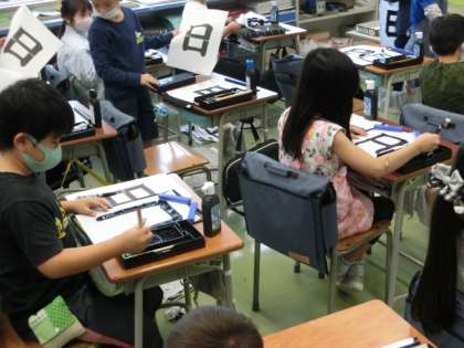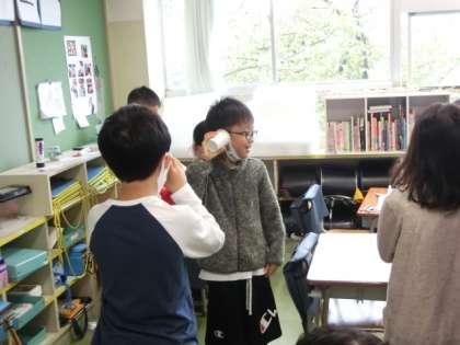 理科では「音をつたえよう」という単元を学習しています。糸電話を実際に体験しながら、楽しみながら音に伝わり方について考えました。糸電話を交差させて4人でもできることから、糸の震えで音が伝わることがわかりました。サンディ先生による英語の授業もありました。今日は「Do you like〜?」「Yes,I do.」「No,I don't.」を学びました。ケーキが好き?と聞かれて「いいえ」と答える子も。みんなが驚いて聞いていたのがおもしろかったです。文字の書き方の学習である習字も進めています。今回は「日」を書きました。筆の使い方が上手になってきました。