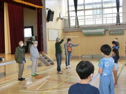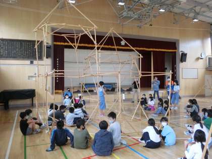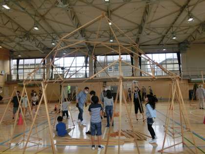 むさしスペシャル2020の「空間ワークショップ」が開催されました。いつもなら夏に行われているイベントですが、今年は秋開催となりました。今回もおやじの会のメンバーでもある長井隆志さんと6人の建築家が講師となってすすめてくれました。6グループに分かれて、木材をゴムでつなぎ合わせ、自分たちの家をつくります。自分たちで話し合って協力してつくりあげる作業は、学校の授業ではなかなかできない活動です。1時間ほどで6グループのそれぞれ違う家が完成しました。最後にグループごとに作り上げた家のコンセプトを紹介しました。後片付けも協力してすすめ、素晴らしかったです。