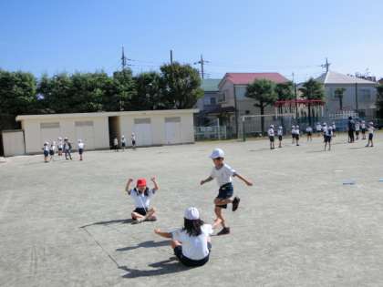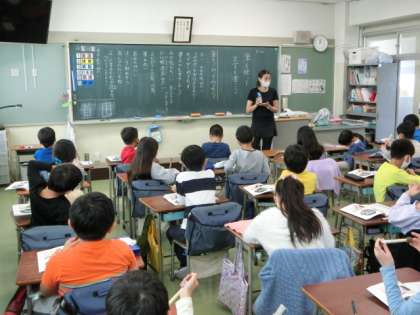 図工では「わたしたちのまち」という題材に取り組みました。まず画用紙にセロハンテープを貼って道を描きます。その後、背景を絵の具で塗りました。セロハンテープが絵の具をはじくので、とてもきれいに描いています。色使いがとても上手でした。日本語では「筆を使って文字を書こう」という単元を学習に入りました。今日は実際に筆を触って、その感触を確かめていました。来週は鈴木先生をおよびして、実際に墨を使って文字を書く予定です。体育館はゴムとび、なわとび、フラーフープなどを使って、楽しく体を動かしています。