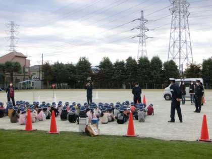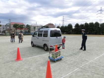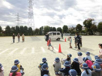 成城警察署の交通課の方々をおよびして、交通安全教室が開かれました。横断歩道の歩き方や、駐車している車の横を通るときのポイントを学びました。警察官の方々のお話をよく聞き、上手に練習に取り組んでいました。今日、学んだことを忘れずに、実際に道路を歩くときも慎重に歩いてほしいなと思います。