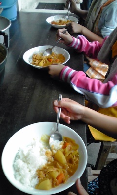 今、協力して作ったカレーをいただきました。
