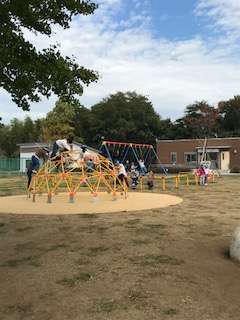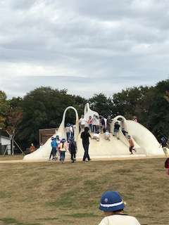 高井戸公園には、ジャングルジムやブランコ、白い石の山、そして広い原っぱがありました。