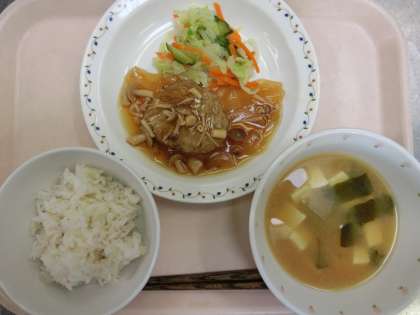 麦ごはん・ハンバーグ和風ソース・野菜のレモン醤油かけ・みそ汁