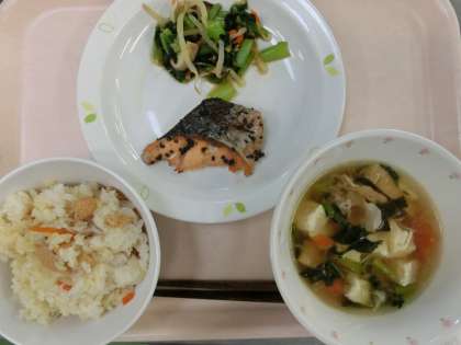 こぎつねごはん・魚の南部焼き・きのこ和え・吉野汁