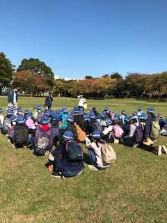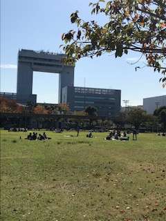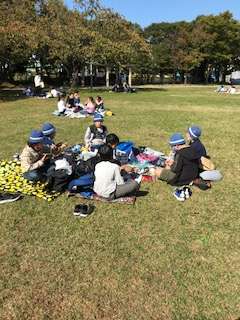 川崎マリエン・東扇島中公園に着きました。少し早いですが、お弁当にしました。紅葉した木々の中、広い原っぱでみんなで食べたお弁当は、格別でした。