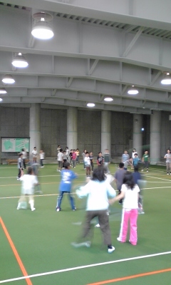 部屋での自由遊びも、多少飽きたので、今、室内広場でドッチボールをしています。