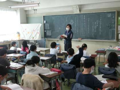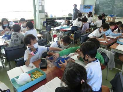 昨日の遠足の疲れも見せず、全員が元気に登校しています。算数では「重さ」を学習しています。今日は大型てんびんを使って、重さを比べていました。それぞれはかる物をブロック何個分かで比べていました。みんなで取り組んでいてとても楽しそうです。国語では「すがたをかえる大豆」という説明文を学習しています。筆者の説明の工夫について、みんなで考えていました。3年生の廊下には図工で作った「むさしのようせい」が飾られています。身の回りにある材料を使って顔を作成しました。それぞれの個性が出ていて、思わず笑ってしまいます。来週の学校公開で、ぜひご覧ください。