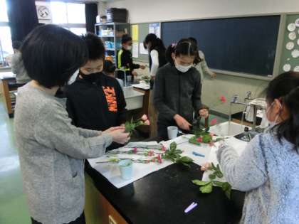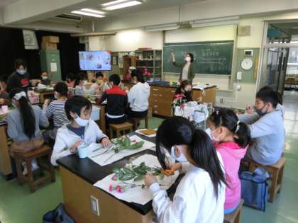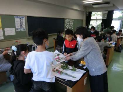 鈴木諒福先生、波崎誠諒先生、アシスタントのグレゴリ・マリア先生をお呼びして、いけ花教室が開かれました。鈴木先生が用意して下さったきれいな花々を各自で工夫して、器に飾ってみました。同じ花々をつかっているのに、まったく一緒のものがありません。みんなの個性が出ていて素敵です。「今日、お母さんにプレゼントしよう。」という声も。そう思う気持ちが素晴らしいなと思いました。