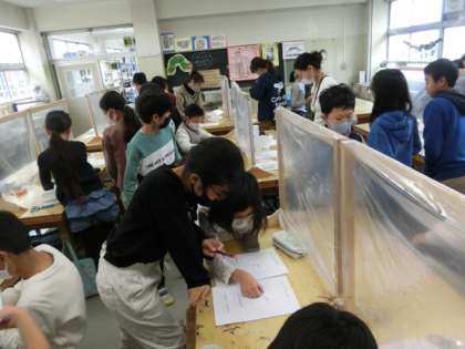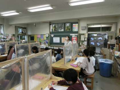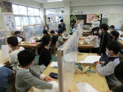 各クラスで、美術鑑賞教室出前授業が行われました。いつもはバスに乗って、世田谷美術館に行って見学しているのですが、今年度は代替として世田谷美術館の学芸員の方が直接来て、出前授業を行ってくれました。世田谷美術館についての紹介を聴いた後、「何が開く?紙遊びで《開きかけのイメージ》を作ろう」にチャレンジしました。1枚の紙を工夫して、開きかけの○○をつくります。チョウやはさみ、扇子など、子供たちのアイデアはさすがです。最後にお互いの作品を見合って終わりました。