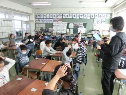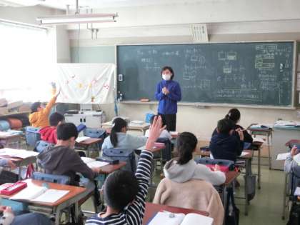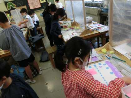 算数では分数のたし算について学びました。「分母が同じときに」→「それぞれの分子をたす」ことを図を使って意味を理解し、そこから計算練習をすすめていました。図工では「スタンプハウス」に取り組んでいます。スポンジやペットボトルのキャップ、ダンボールなどをスタンプにして、自由に絵を描いていきます。みんな楽しく進めています。日本語では百人一首カルタに挑戦。先生の詠む声に集中して、札をとっていました。