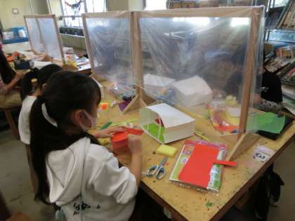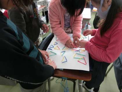 算数では「三角形」の単元を学習しています。3種類の長さの違う色のストローを使って、いろいろな三角形を作りました。よく見ると、同じ長さの三角形、二本だけ同じ長さの三角形、すべて長さの違う三角形ができあがりました。長さごとに色が違うので、よくわかります。道徳では「木の中にバットが見える」という教材を使って、人のために役に立つことについて考えました。図工では「プニチャンワールド」の作製をしています。紙袋を開くと、プニちゃんの世界があらわれます。水族館や草原?、子供たちの世界は見ていてとても楽しいですね。